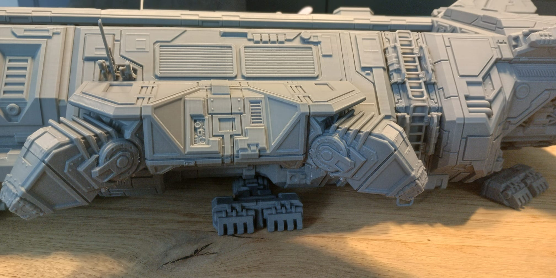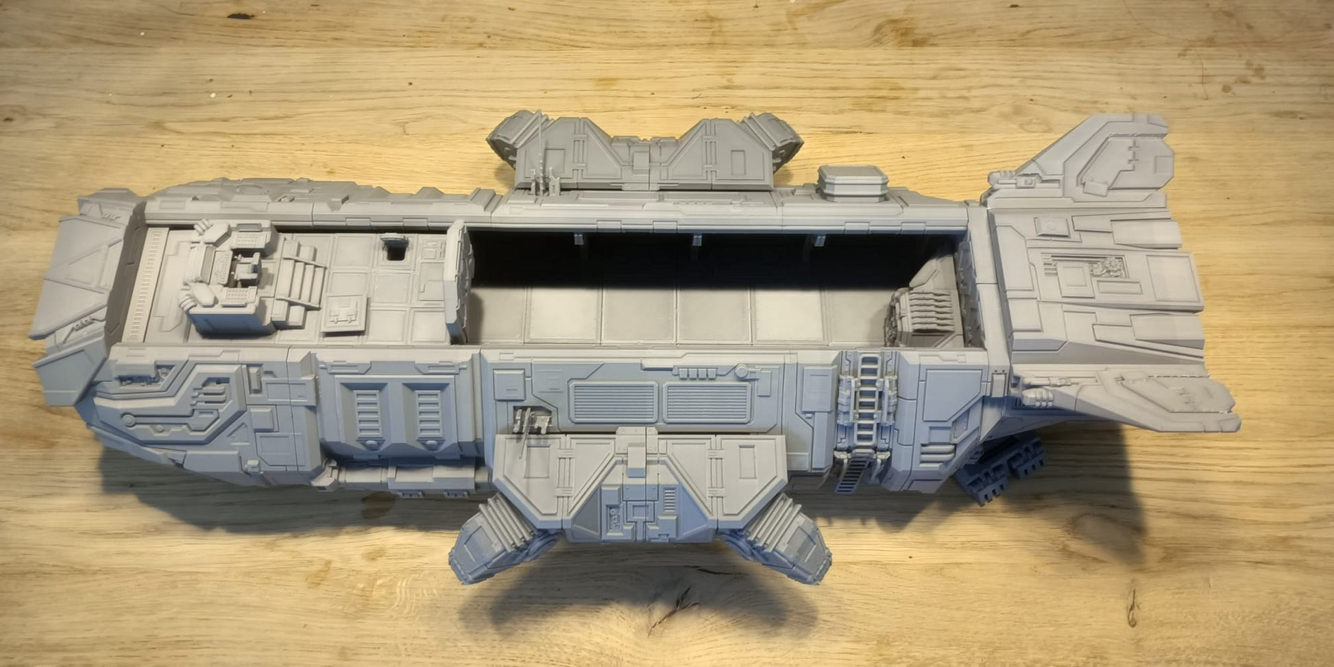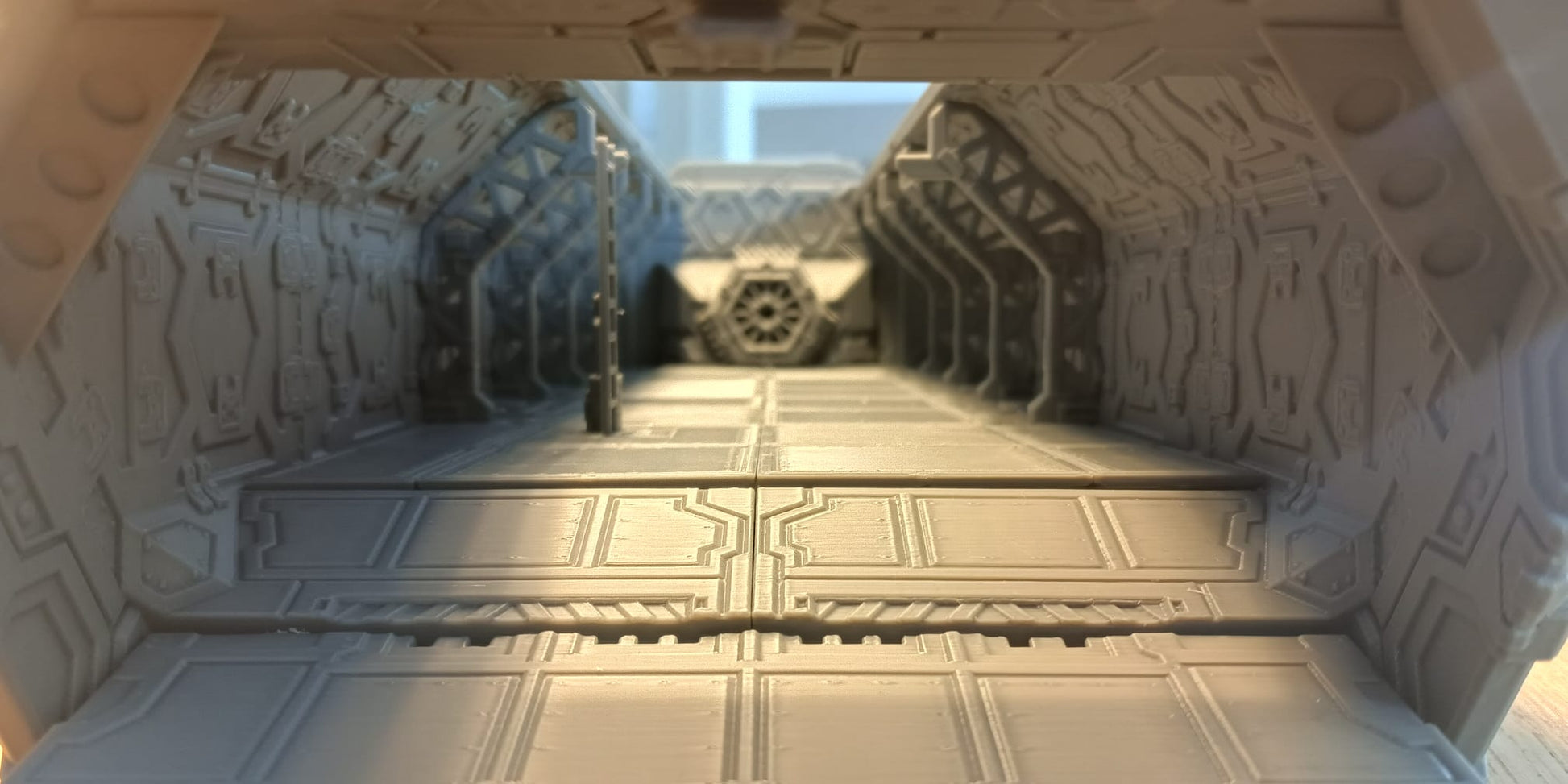 Der Innenraum ist Gridforge-fähig und verwendet ein modulares Kachelsystem, mit dem Sie Wände, Kisten und Missionsausrüstung im Handumdrehen neu anordnen können. Die Kacheln rasten sicher ein, sodass sich das Layout während oder zwischen Missionen leicht anpassen lässt – ideal für sich entwickelnde Szenarien, schnelle Umrüstungen oder storybasiertes Spielen.